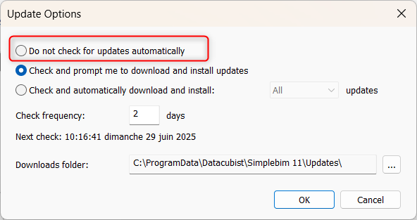 Les mises à jour automatiques sont une excellente fonctionnalité pour garder votre Simplebim à jour et elles sont activées par défaut. Cependant, dans certains scénarios, vous souhaitez le désactiver.